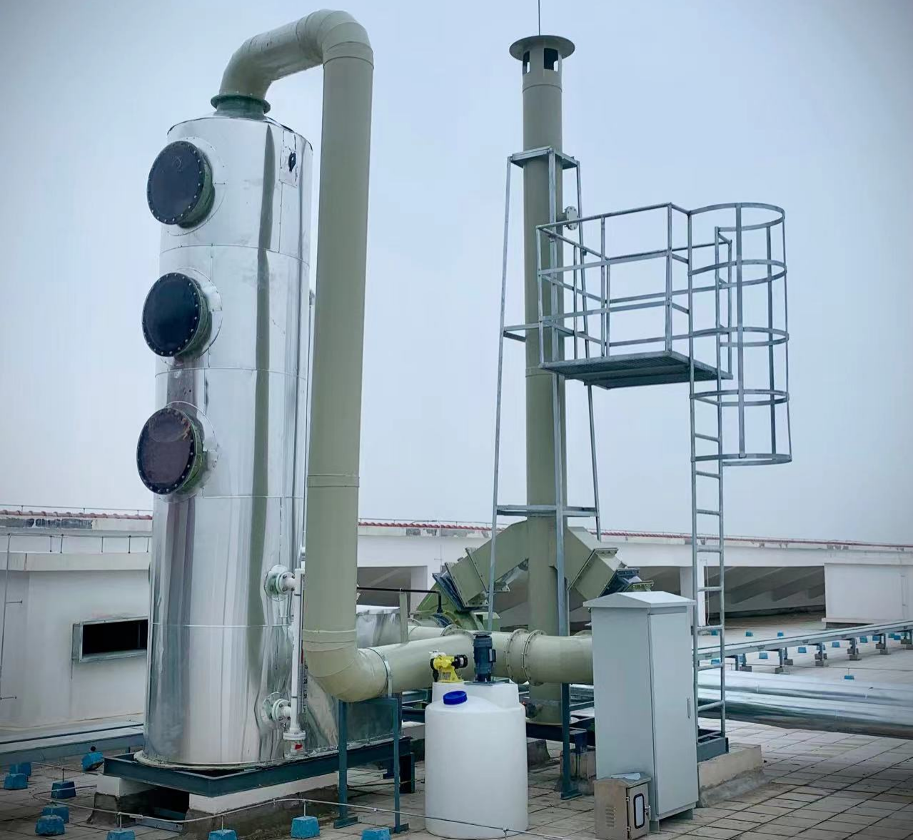 喷淋塔、风机、电控、烟囱支架、检测平台、爬梯护栏,设备间连接管道。