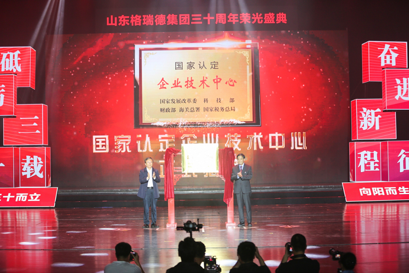 多年来,山东格瑞德集团有限公司专注技术创新、人才培养和平台搭建,取得了不菲的成绩,被评为德州市同行业唯一一家“国家认定企业技术中心”。据了解,国家认定企业技术中心是由国家授予的,国内规格最高、影响力最大的技术创新平台之一,它代表着格瑞德在创新人才、技术积累、创新平台、技术产出和创新效益等方面在行业中的领先地位。庆典现场,德州市人民政府副市长、民进市委主委陈晓强,山东格瑞德集团有限公司董事长管印贵共同为“国家认定企业技术中心”揭牌,未来,这一平台必将带动全市新能源新材料产业的发展,为行业科技创新赋能。